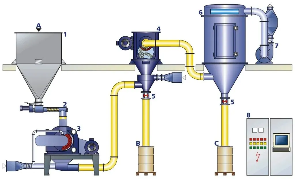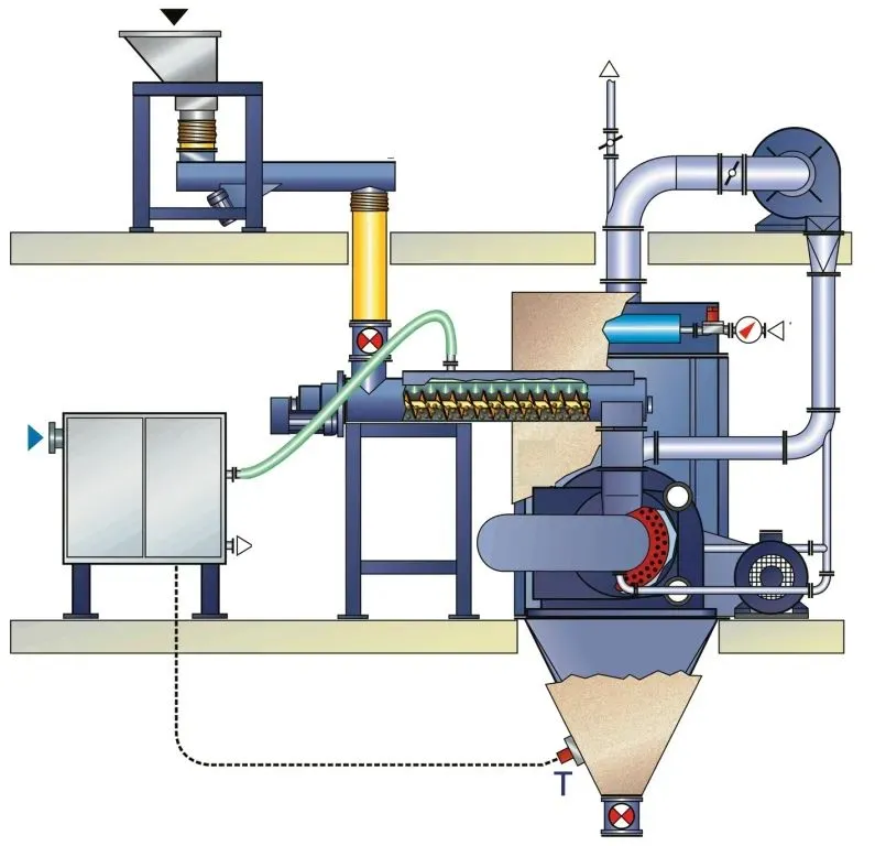 产品和系统可以通过将冷却剂直接注入磨机中来冷却,或者,如果需要更长的停留时间或更低的温度,则可以通过在螺杆冷却器中对材料进行预冷和脆化来冷却。