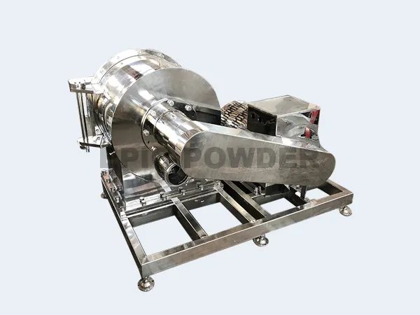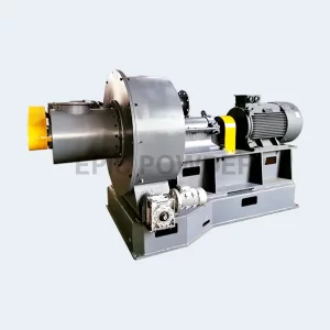 MJL-W分级式冲击磨,是粉碎盘与分级轮分别独立驱动的,粉碎盘立式安装,分级轮卧式安装。物料由加料系统均匀的送入粉碎室受到高速旋转的粉碎盘的强烈冲击,同时受到离心力的作用,与粉碎齿圈发生碰撞。冲击、剪切、摩擦、碰撞等多种力量的综合作用,使物料被粉碎。被粉碎的物料随气流运动到分级区,通过变频调节的分级轮对粗细物料进行分离。符合细度要求的细粉产品被气流带入旋风分离器和除尘器收集,粗料返回粉碎区进行再次粉碎。